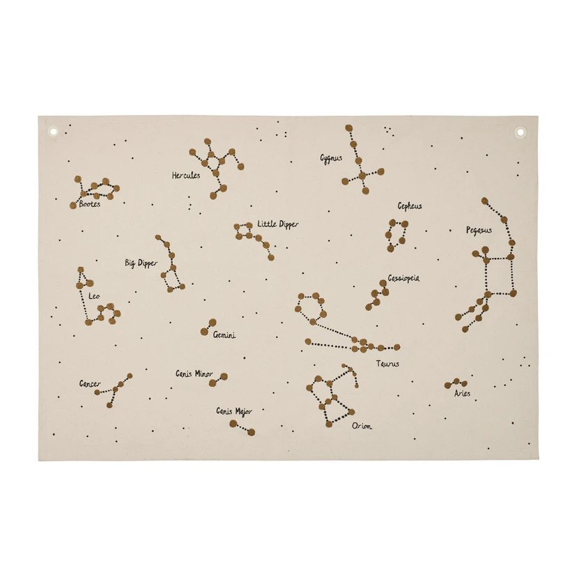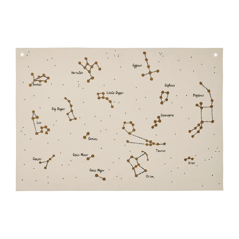 Pokud nemáte možnost pozorovat noční oblohu, zajímavou alternativou je textilní mapa Constellation. Tento tapisérie vyrobená z organické bavlny s certifikátem GOTS a vyšívaná známými souhvězdími je inspirativní i poučná. Všem fanouškům pozorování hvězd nabízí nádhernou vizuální kulisu. Díky dvěma našitým očkům v horních rozích se snadno zavěšuje na zeď.
