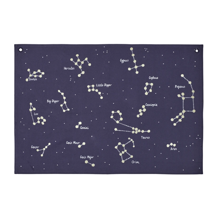 Pokud nemáte možnost pozorovat noční oblohu, zajímavou alternativou je textilní mapa Constellation. Tento tapisérie vyrobený z organické bavlny s certifikátem GOTS a vyšívaný známými souhvězdími je inspirativní i poučný. Všem fanouškům pozorování hvězd nabízí nádhernou vizuální kulisu. Díky dvěma našitým očkům v horních rozích se snadno zavěšuje na zeď.