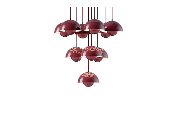 &Tradition představuje lustr Flowerpot VP10 Ø53 Dark Plum a oživuje tak ikonický design Vernera Pantona. Inspirována jeho imerzivními prostředími, jaká lze vidět v projektech jako Spiegel-Verlag z roku 1969 a instalace „Pantorama“ z roku 1979, zahrnuje série Flowerpot nyní také nové lustry VP10. Ty lze konfigurovat buď s 10, nebo 31 závěsnými světly, což umožňuje vytvářet působivé světelné instalace.